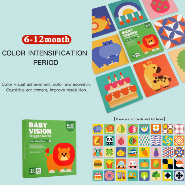 - Stage 3: (6-12 months): Color Visual Cards – Bright, engaging images to stimulate color recognition and imagination.